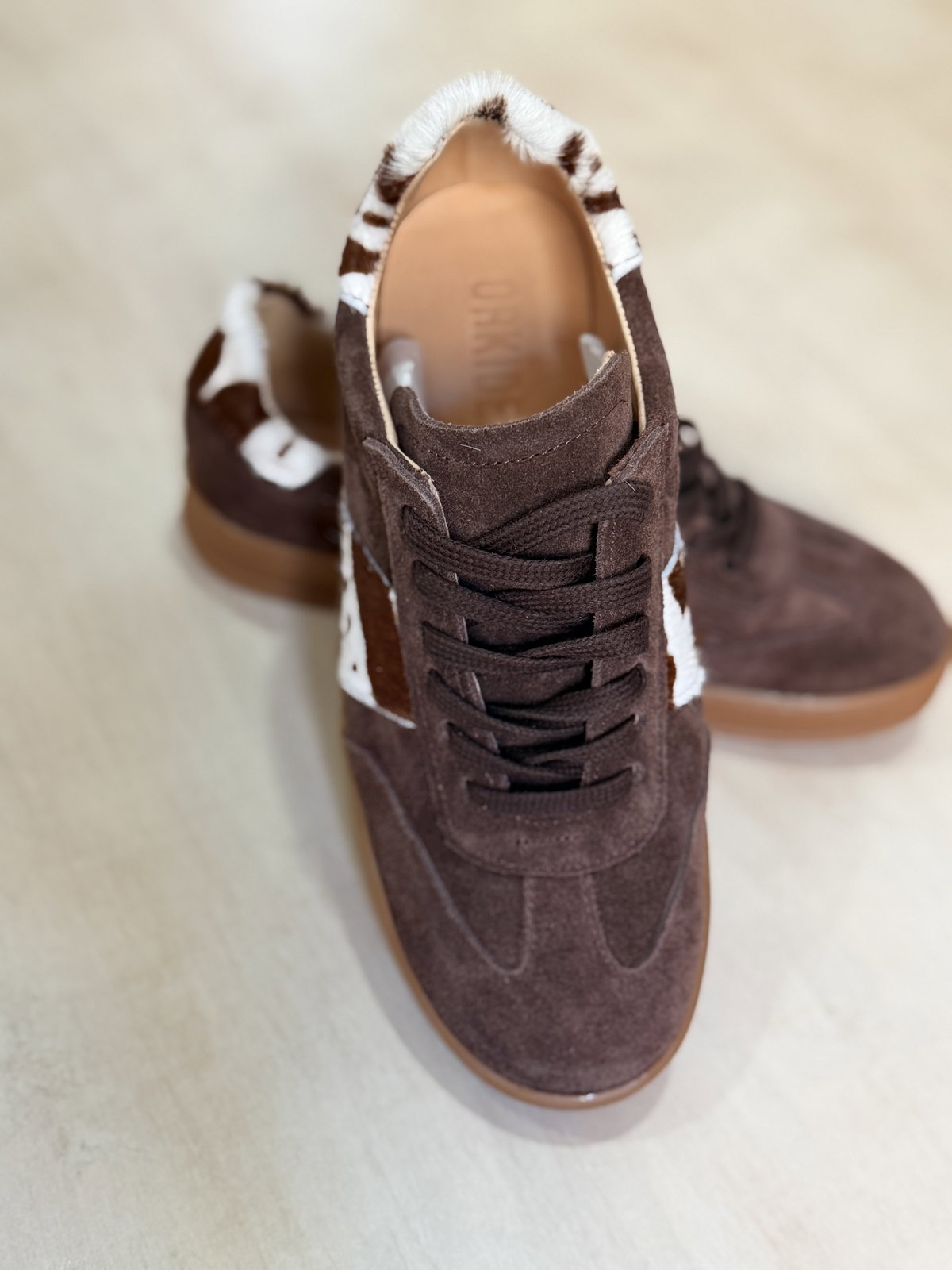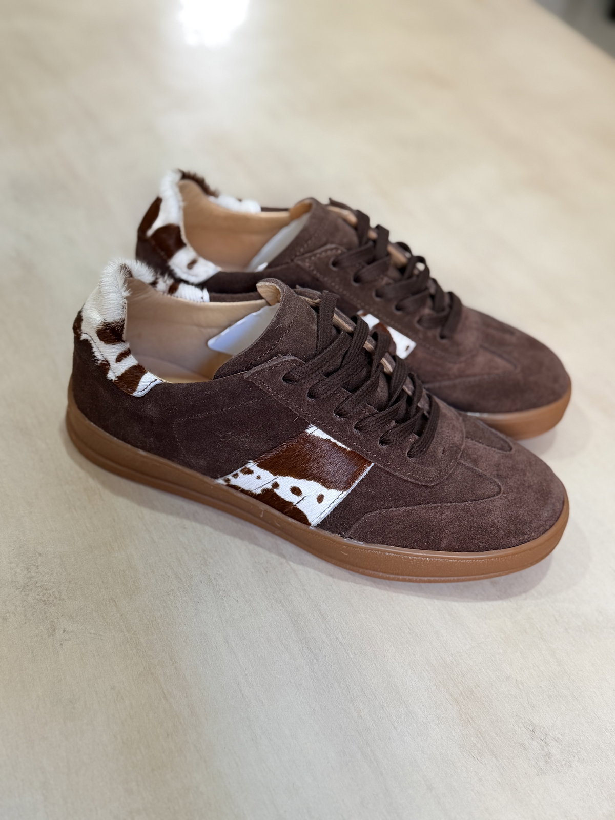 Cuero vacuno con apliques de gamuza con pelo estampa vaca.